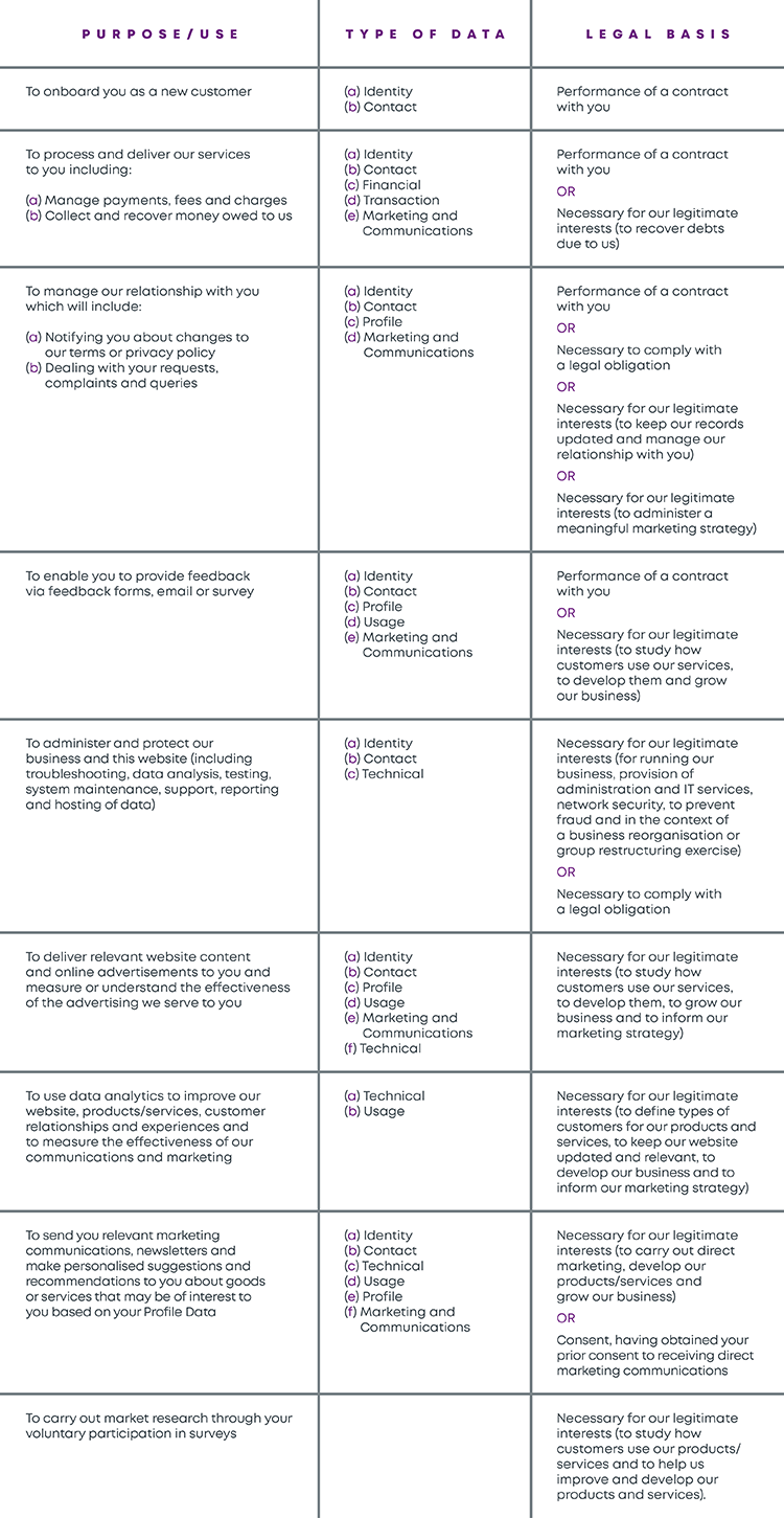 - Withdraw consent at any time where we are relying on consent to process your personal data (see the table in section 4 for details of when we rely on your consent as the legal basis for using your data). However, this will not affect the lawfulness of any processing carried out before you withdraw your consent. If you withdraw your consent, we may not be able to provide certain products or services to you. We will advise you if this is the case at the time you withdraw your consent.